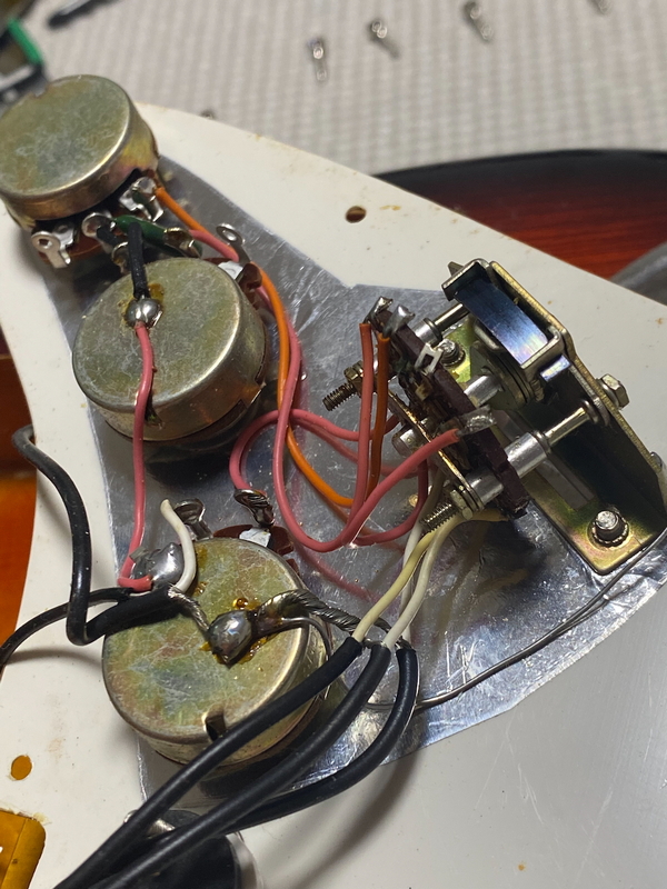 The pickups are awful. Nice the attempt to keep them quiet with the brass bass plate. The switch is three position,
